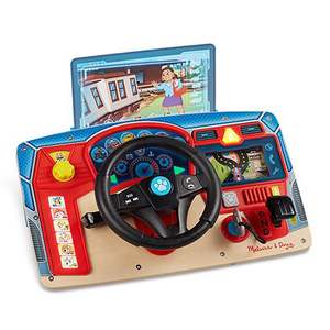 • Features a realistic steering wheel mounted on a wooden dashboard