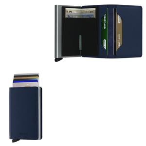 The Slimwallet is a modern take on the classic billfold. Its slim profile makes the Slimwallet fit perfectly into every pocket. The open exterior is cut extra wide to hold cards, banknotes and receipts. The Cardprotector mechanism allows you to slide out cards with one simple motion, while the aluminum protects your cards from bending, breaking and unwanted wireless communication. Holds 4 embossed or 6 flat cards, 6 extra cards, banknotes, business cards, and receipts. Whether you are wearing a suit or jeans, this smooth leather with its natural glossy finish fits every style. Made of European cowhide. Made in sheltered workshops in the Netherlands. Measures 4.02 H x 2.56 W x .63 D. Color: Navy with silver card protector.