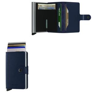 Sustainability starts with products that last. This also means timeless designs that never go out of style. With a neutral color palette, these wallets are ideal for everyday use for years to come. This is the essence of The Original Collection. Small in size and surprisingly large in storage capacity, the Miniwallet combines the best of both worlds. The exterior holds banknotes, receipt and cards, while the aluminum cardprotector allows you to slide out cards with one simple motion and protects them from bending, breaking and unwanted wireless communication. Holds 4 embossed or 6 flat cards, 4 extra cards, banknotes, and business cards. Snap closure. Measures 4.02 H x 2.56 W x .83 D. Color: Navy leather with silver card protector.