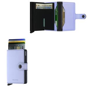 Small in size and surprisingly large in storage capacity, the Miniwallet combines the best of both worlds. The exterior holds banknotes, receipt and cards, while the aluminum card protector allows you to slide out cards with one simple motion and protects them from bending, breaking and unwanted wireless communication. Holds 4 embossed or 6 flat cards, 4 extra cards, banknotes, and business cards. Snap closure. The soft and smooth surface of our Matte wallet is both distinctively colorful and discretely stylish. A rugged leather that can withstand the hustle and bustle of everyday life. Made in sheltered workshops in The Netherlands. Measures 4.02 H x 2.56 W x .83 D. Color: Matte Lilac with black card protector.