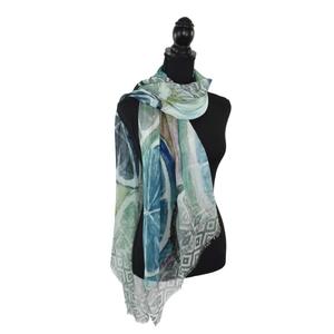 Nothing says summer like citrus! Get your dose of vitamin-C this season this ultra lightweight modal scarf. Featuring a painterly fruit motif with geometric accents and eyelash fringe ends. Material: 100% Micro Modal. Measures: 71 in x 27.5 in.